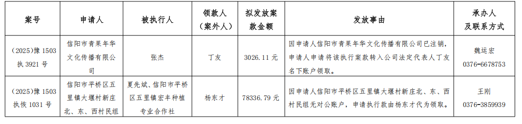 为严格执行案款发放,规范执行案款发放程序,确保案款发放安全,落实人民法院向案外人发放案款公示要求,根据《最高人民法院关于执行款物管理工作的规定》的规定,现对以下执行案款发放事宜予以公示,公示期为三日。公示期间,案件当事人或其他利害关系人对案款发放有异议的,可在公示期内向本院提出并提交相关证据材料佐证,由本院审查处理。公示期满无异议,将按执行案款管理相关规定办理发放手续。监督电话:0376-6362283。