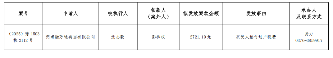 为严格执行案款发放,规范执行案款发放程序,确保案款发放安全,落实人民法院向案外人发放案款公示要求,根据《最高人民法院关于执行款物管理工作的规定》的规定,现对以下执行案款发放事宜予以公示,公示期为三日。公示期间,案件当事人或其他利害关系人对案款发放有异议的,可在公示期内向本院提出并提交相关证据材料佐证,由本院审查处理。公示期满无异议,将按执行案款管理相关规定办理发放手续。监督电话:0376-6362283。