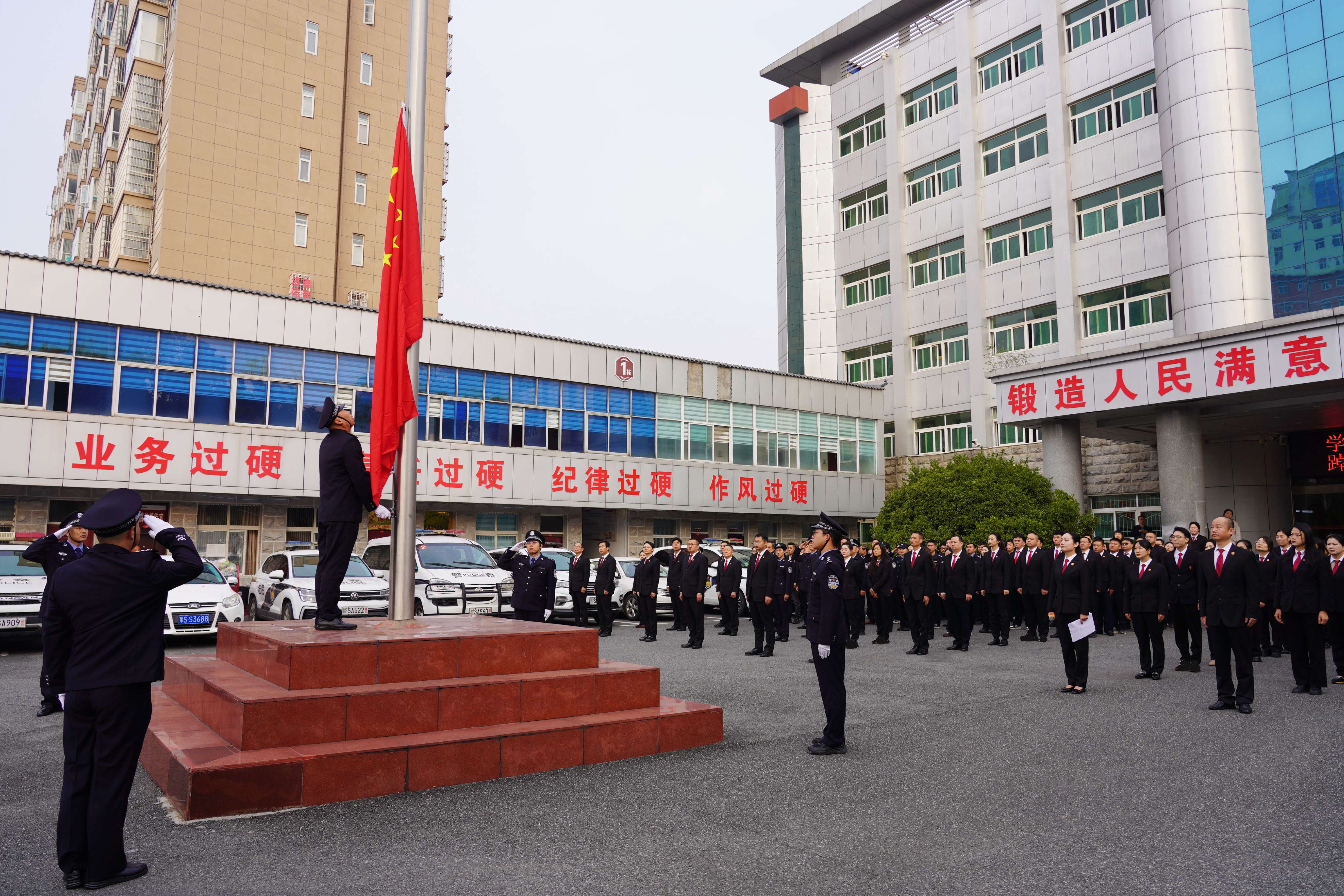 晨光熹微,全体干警已阵列严整,屏息凝神。当雷霆万钧的国歌划破长空,五星红旗迎风展开,冉冉升起。一道道目光紧随国旗,肩上的法徽与天际的赤色交相辉映,无声诉说着对法治信仰的铮铮誓言与无悔担当