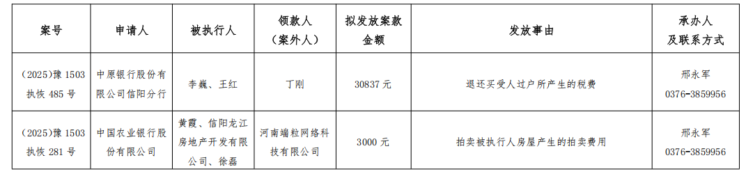 为严格执行案款发放,规范执行案款发放程序,确保案款发放安全,落实人民法院向案外人发放案款公示要求,根据《最高人民法院关于执行款物管理工作的规定》的规定,现对以下执行案款发放事宜予以公示,公示期为三日。公示期间,案件当事人或其他利害关系人对案款发放有异议的,可在公示期内向本院提出并提交相关证据材料佐证,由本院审查处理。公示期满无异议,将按执行案款管理相关规定办理发放手续。监督电话:0376-6362283。