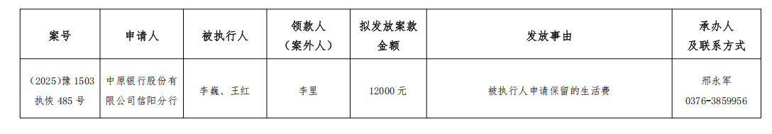 为严格执行案款发放,规范执行案款发放程序,确保案款发放安全,落实人民法院向案外人发放案款公示要求,根据《最高人民法院关于执行款物管理工作的规定》的规定,现对以下执行案款发放事宜予以公示,公示期为三日。公示期间,案件当事人或其他利害关系人对案款发放有异议的,可在公示期内向本院提出并提交相关证据材料佐证,由本院审查处理。公示期满无异议,将按执行案款管理相关规定办理发放手续。监督电话:0376-6362283。