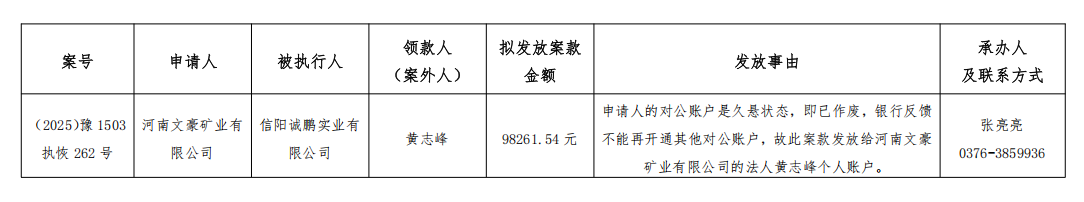 为严格执行案款发放,规范执行案款发放程序,确保案款发放安全,落实人民法院向案外人发放案款公示要求,根据《最高人民法院关于执行款物管理工作的规定》的规定,现对以下执行案款发放事宜予以公示,公示期为三日。公示期间,案件当事人或其他利害关系人对案款发放有异议的,可在公示期内向本院提出并提交相关证据材料佐证,由本院审查处理。公示期满无异议,将按执行案款管理相关规定办理发放手续。监督电话:0376-6362283。