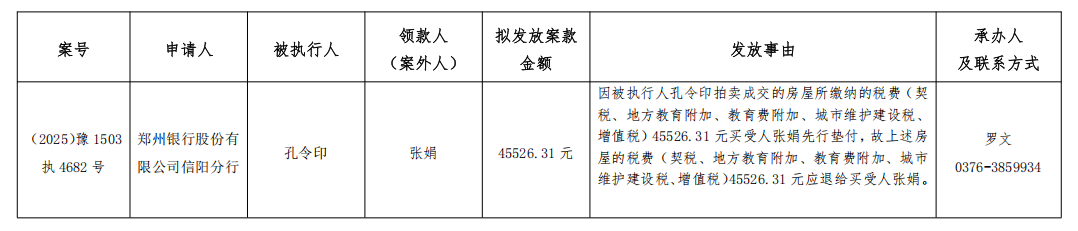 为严格执行案款发放,规范执行案款发放程序,确保案款发放安全,落实人民法院向案外人发放案款公示要求,根据《最高人民法院关于执行款物管理工作的规定》的规定,现对以下执行案款发放事宜予以公示,公示期为三日。公示期间,案件当事人或其他利害关系人对案款发放有异议的,可在公示期内向本院提出并提交相关证据材料佐证,由本院审查处理。公示期满无异议,将按执行案款管理相关规定办理发放手续。监督电话:0376-6362283。