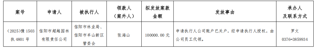 为严格执行案款发放,规范执行案款发放程序,确保案款发放安全,落实人民法院向案外人发放案款公示要求,根据《最高人民法院关于执行款物管理工作的规定》的规定,现对以下执行案款发放事宜予以公示,公示期为三日。公示期间,案件当事人或其他利害关系人对案款发放有异议的,可在公示期内向本院提出并提交相关证据材料佐证,由本院审查处理。公示期满无异议,将按执行案款管理相关规定办理发放手续。监督电话:0376-6362283。