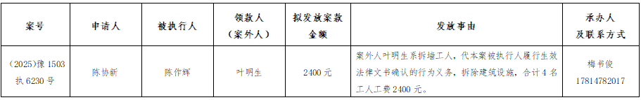 为严格执行案款发放,规范执行案款发放程序,确保案款发放安全,落实人民法院向案外人发放案款公示要求,根据《最高人民法院关于执行款物管理工作的规定》的规定,现对以下执行案款发放事宜予以公示,公示期为三日。公示期间,案件当事人或其他利害关系人对案款发放有异议的,可在公示期内向本院提出并提交相关证据材料佐证,由本院审查处理。公示期满无异议,将按执行案款管理相关规定办理发放手续。监督电话:0376-6362283。